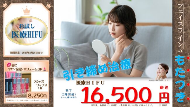 【お試し】フェイスラインのもたつき HIFU顎下・ラシャスリップス   2026年2月28日まで